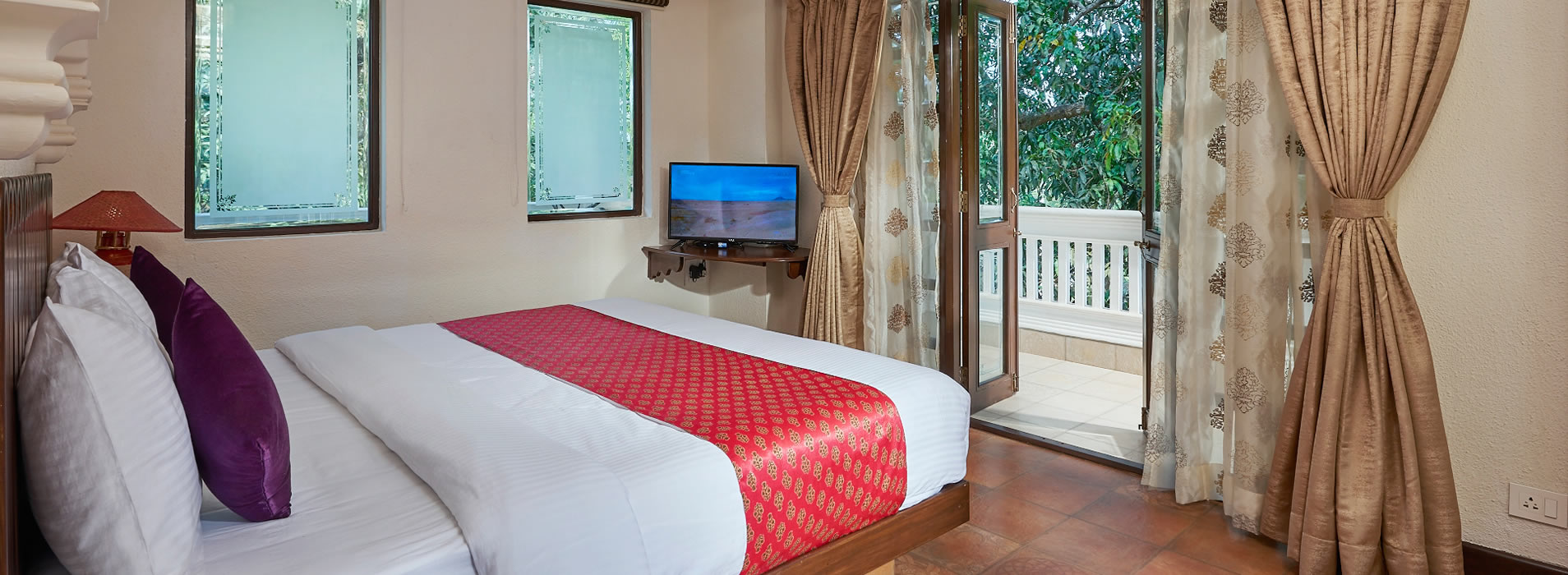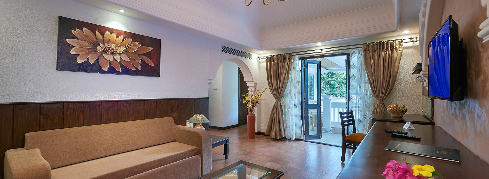 Our Grand Suites are Fully air conditioned with a spacious living room, a comfortable king size bed and a sofa cum bed.This Suite is recommended for a family with children.Options with regards to the view include the Pool view or the Forest view with an attached private terrace as well as a balcony.